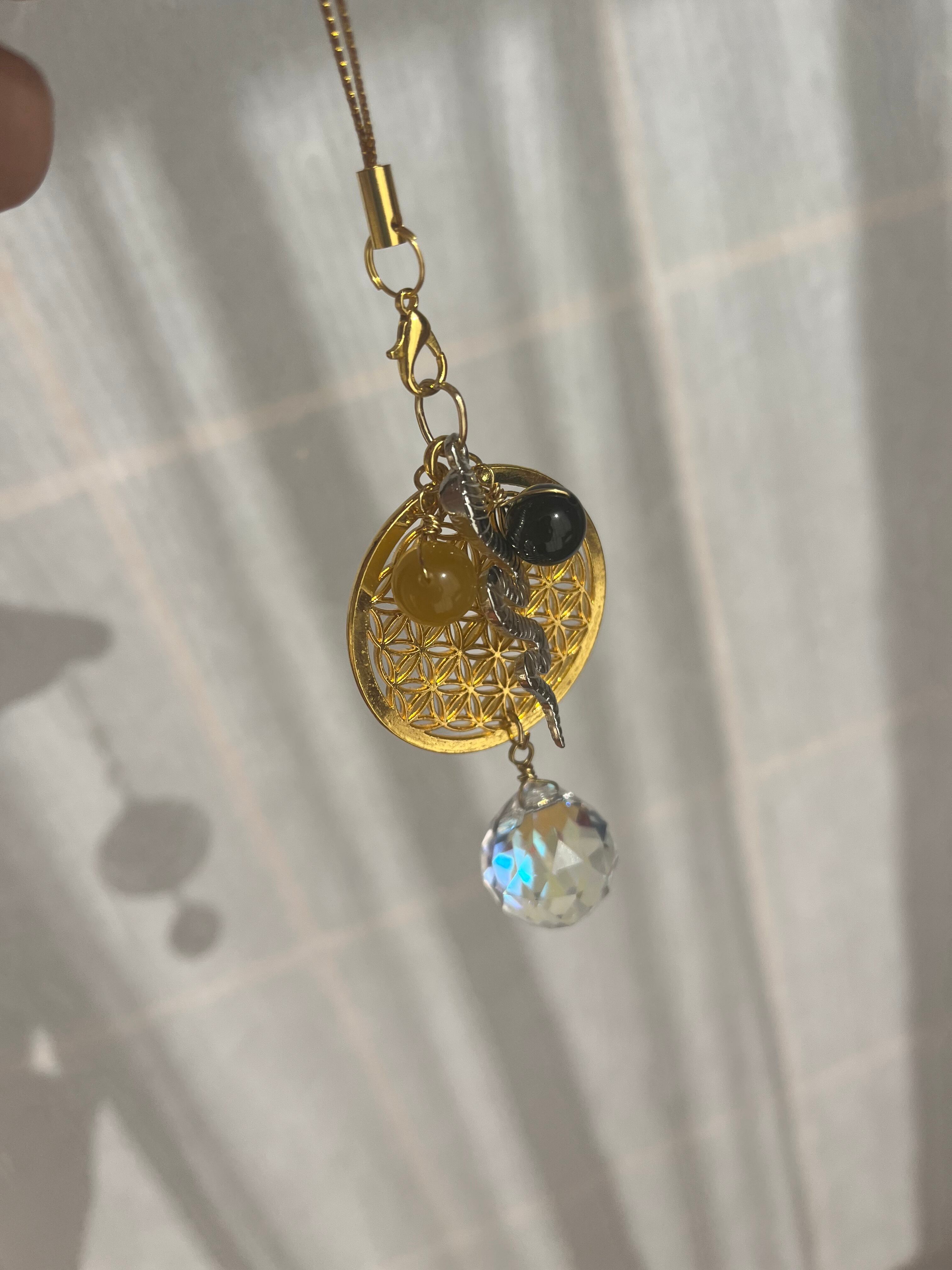 - 装飾: クリスタルのサンキャッチャー、天然石(ゴールデンタイガーアイ&ブラックトルマリン)